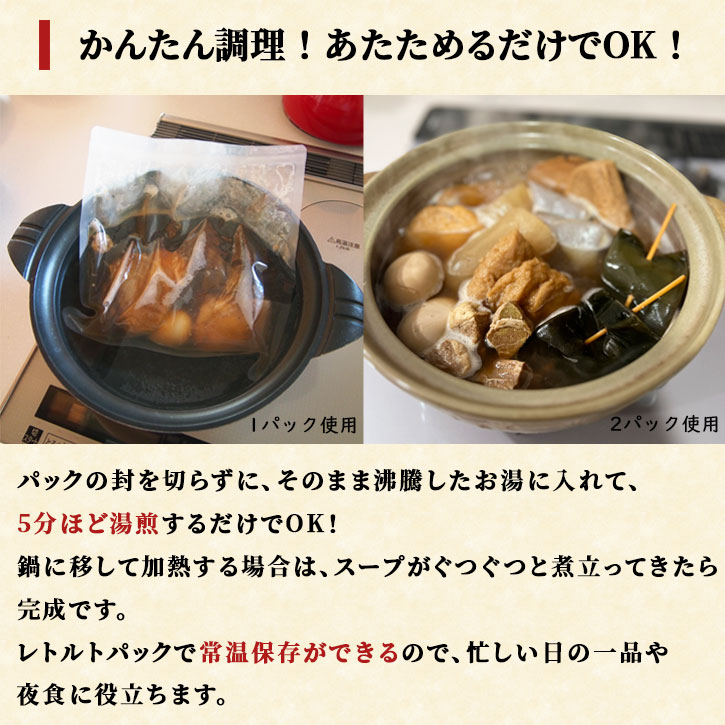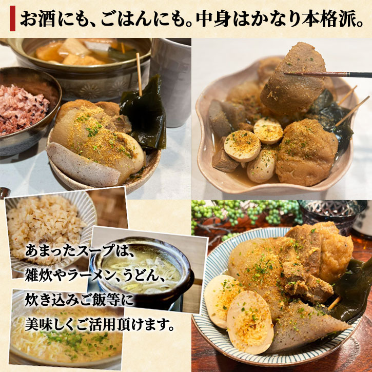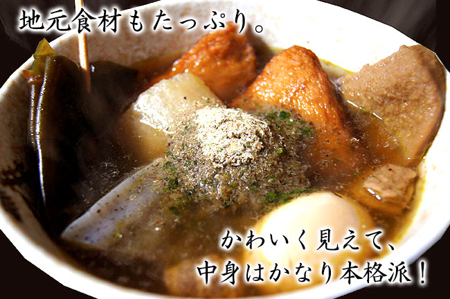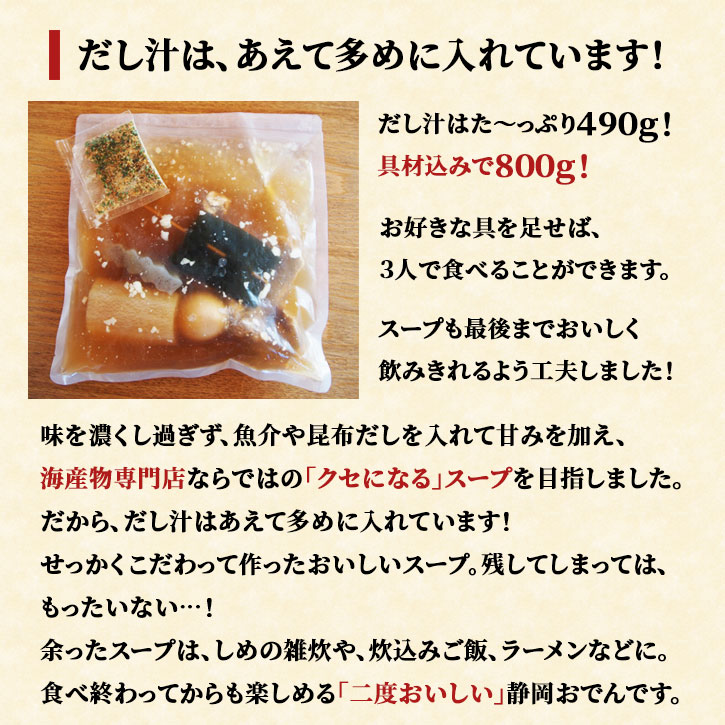 | 静岡おでんのだし汁は濃く、飲まないのが一般的。 当店では、最後までおいしく飲みきれるよう、濃くしすぎず、 魚介、昆布だしを入れ、甘みを加えたクセになるスープに仕上げました。 |