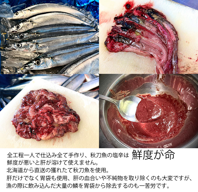 | 原材料 | 秋刀魚の塩辛:さんま(国産)、食塩、白味噌、きび砂糖、かんずり(唐辛子、糀、柚子)、純米酒、(一部に大豆、小麦を含む) 秋刀魚ジャパネスク:さんま(国産)、食塩、米油(にんにく、真昆布、椎茸、唐辛子)、純米酒、だし醤油、鰹削り節、(一部に大豆、小麦を含む) |