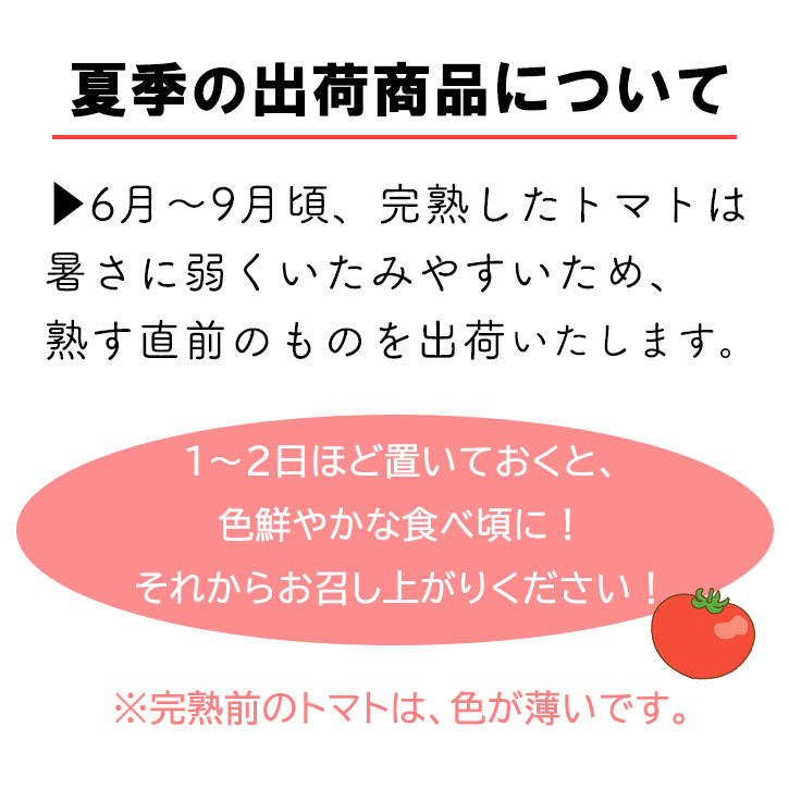 ※熟したトマトは暑さに弱いため、7〜9月のご配送の場合、熟す直前のトマトをお送りしております。