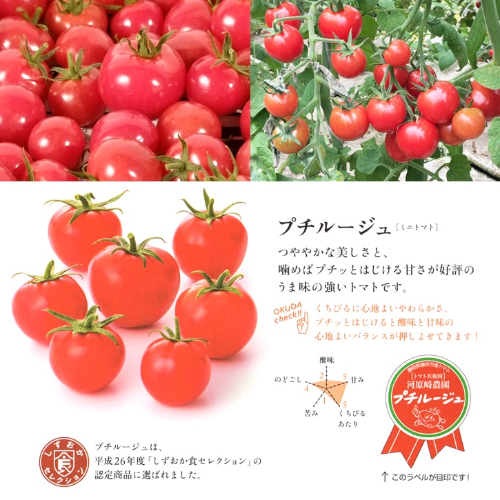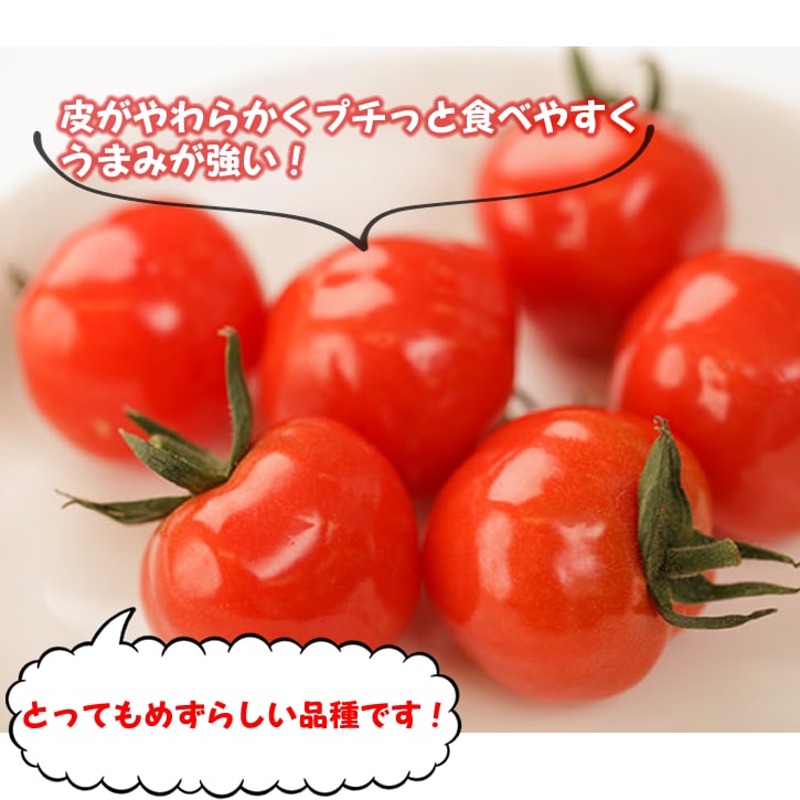 糖度9〜12度!ルビーのようなつややかな美しさと、くちびるに心地良くやわらかな皮は新感覚。噛めばプチっと弾け、甘さと旨味の強いミニトマトです。