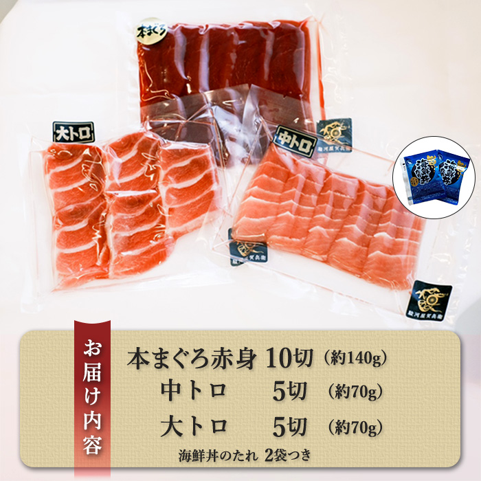 ・本まぐろ赤身 70g(5切)×2袋 ・本まぐろ中トロ 70g(5切)×1袋 ・本まぐろ大トロ 70g×(5切)×1袋 |