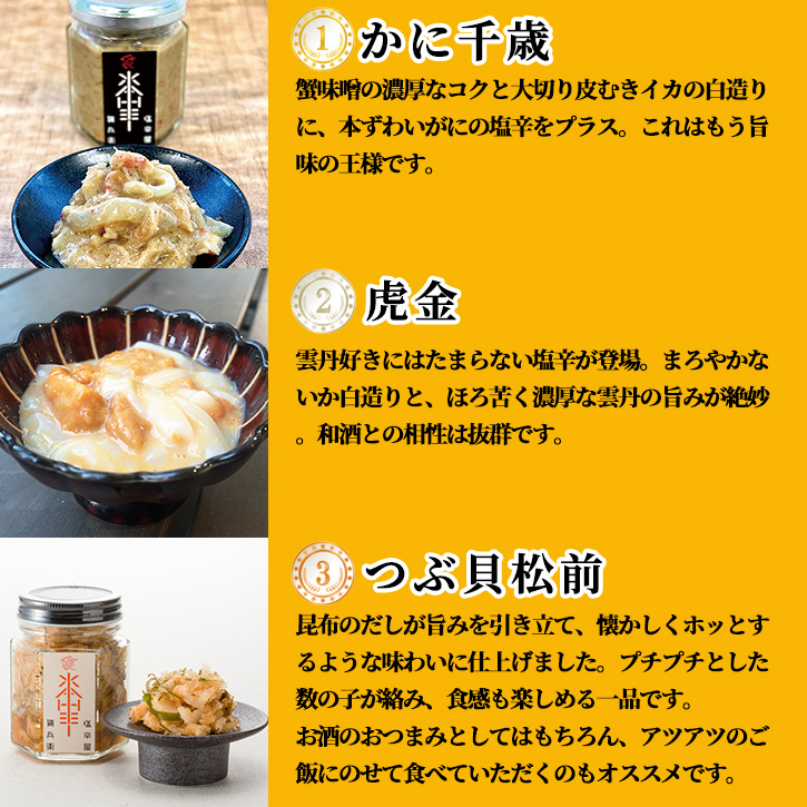 【商品内容】かに千歳90g、虎金80g、つぶ貝松前80g
