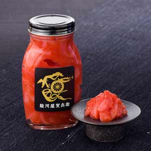 新鮮な皮むきイカをたっぷりの甘辛い明太子に漬け込みました