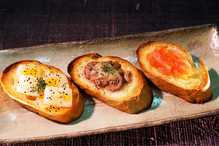 バケットに塩辛をのせて焼くだけの簡単おつまみ。ビールやサワー、ワインと相性ピッタリ。お子様のおやつにも。